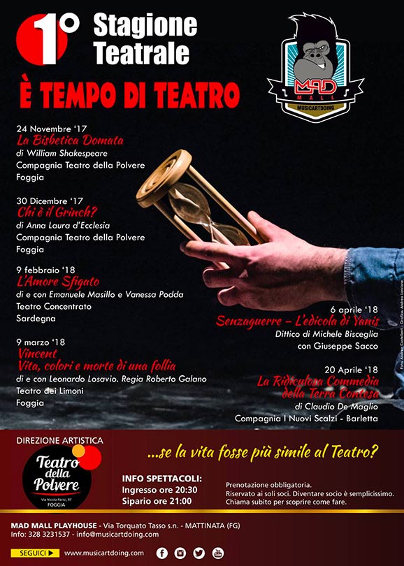 La stagione prevede 6 spettacoli, da novembre ad aprile, il venerdì sera presso la Playhouse del MAD Mall di Mattinata. Si comincia il 24 novembre con un grande classico di William Shakespeare: La Bisbetica Domata”, messo in scena proprio dalla Compagnia del Teatro della Polvere. Nel periodo natalizio, invece, tocca a “Chi è il Grinch?” di Anna Laura d’Ecclesia, spettacolo per grandi e piccini, previsto il 30 dicembre.