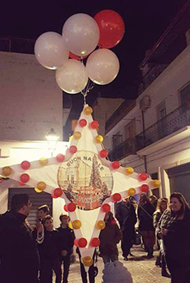 Dopo aver animato il periodo pre natalizio, il Circolo Oasis, in occasione del Santo Natale, ha organizzato un incontro in Piazza per porgere a tutti i più sinceri auguri di buon Natale con pandoro e Spumante offerti dal Supermercato Trotta. Il momento clou della serata sarà alle ore 20.00, quando sarà lanciata la Stella del Natale. La creazione artistica a forma di stella che la ditta Partylandia di Mattinata crea in occasione del Natale.