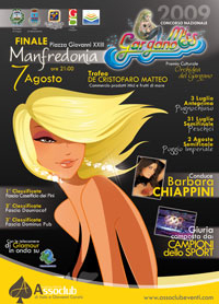 Venerdì 7 agosto nella stupenda piazza Giovanni XXIII di Manfredonia, alle ore 21.00, si terrà la finale del concorso nazionale di bellezza Miss Gargano 2009, le cui protagoniste sono venti ragazze che sono riuscite ad arrivare in finale dopo una serie di valutazioni da parte di una “speciale” ed attenta giuria costituita da personaggi sportivi, come Michele Pirro campione di motociclismo affiancato da moltissimi altri esponenti dello sport tra cui Michele Barbone in veste di presidente della giuria, Vincenzo di Pinto, Giacomo Leone, Delio Rossi, Francesco Attolico, Marinella Falca, Walter Magnifico e Khieo Itthipol.