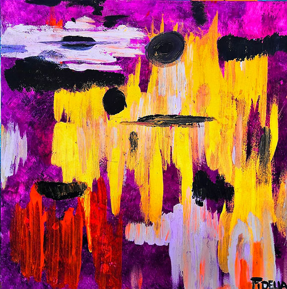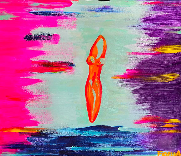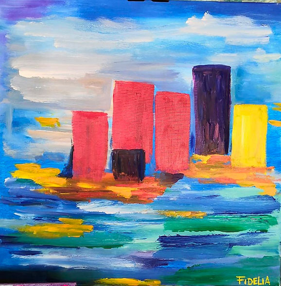 Sono diversi i paesaggi che potrete riscontrare nelle tele di Fidelia, e se non saranno paesaggi saranno comunque tele che vi scuoteranno l’animo per via di quei colori che infiammano e verrebbe voglia di citare “le belve francesi” di Henrì Matisse e compagni, da tutti conosciuti come i “Fauves”. Oppure sarete incantati dalle tele dove il colore è stato sgocciolato nella migliore tradizione dell’espressionismo astratto statunitense con la tecnica del dripping. E per rimanere in tema con questo tipo di tecnica pittorica ci piace ricordare il dipinto dedicato alla metropoli multietnica e multiculturale per eccellenze che è New York City. Fidelia l’ha dipinta dandole una aura di colore che nella realtà quella città non ha, e questo è una delle belle libertà che una pittrice può prendersi, interpretare un luogo dove il multicolore è presente nelle donne e negli uomini che lo vivono me è assente nei suo edifici in massima parte protesi verso il cielo ma dai colori spenti dell’acciaio e del vetro.