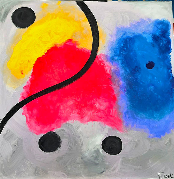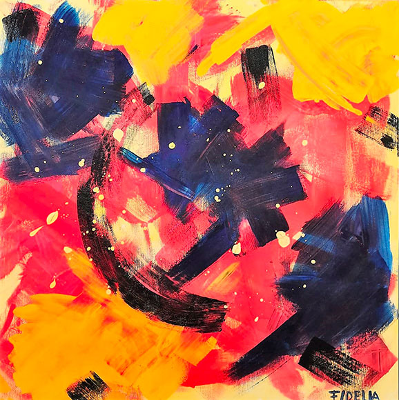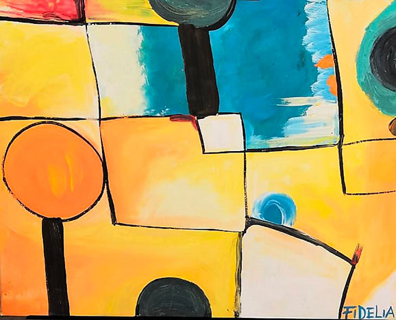 La pittura di Fidelia è astratta, ma attenzione non è intesa come la fuga dalla realtà, bensì come una lettura della stessa in chiave surrealista, con influenze certe di uno dei maestri di tale avanguardia: il catalano Joan Mirò. Individuare delle influenze nel suo fare pittura non significa sminuire l’operato di Fidelia, bensì apprezzare la sua attenzione verso quello che è stato fatto come fonte di conoscenza e poi di espressione di nuove interpretazioni.