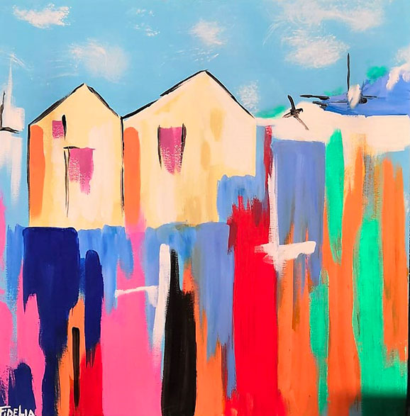 Dipinti dai poetici titoli, ed uno di questi è quanto mai attuale: “L’Infinito”. Qui la nostra Fidelia ci offre una visione che è quella di uno scorcio dello Junno di Mattinata, ovvero di quella parte più antica dell’abitato caratterizzato dai tetti a capanna di quelli che un tempo erano povere case in pietra, terra e legno. Uno scorcio urbano che si trova sospeso tra due livelli di colore, quello superiore con il cielo azzurro del Gargano e quello inferiore definito da un arcobaleno in versione verticale. E guardando questa tela non si può non andare alla poesia di Leopardi e alla sua stupenda chiusura che bene si attanaglia a Mattinata, al Gargano e al suo Mare: “…E il naufragar m’è dolce in questo mare.”