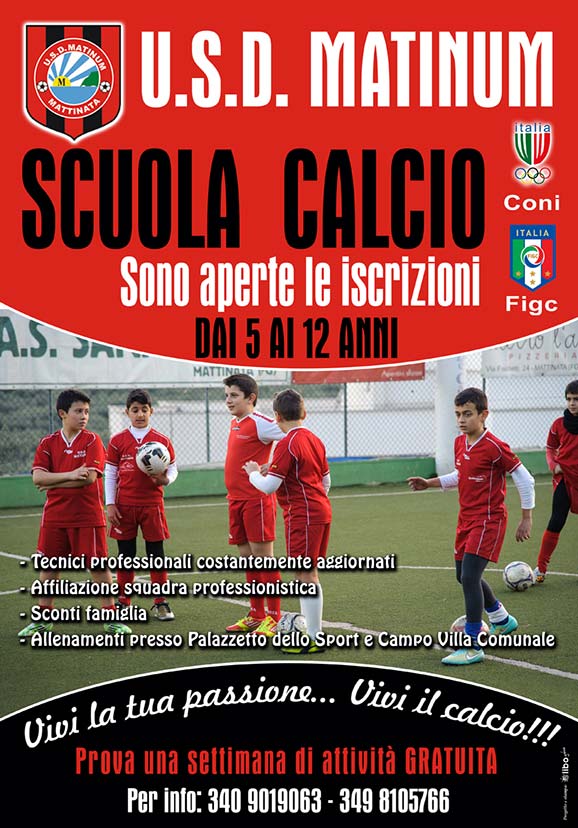 L’Unione Sportiva MATINUM informa che sono aperte le iscrizioni per la Scuola Calcio stagione sportiva 2015/2016 per i ragazzi dai 5 ai 12 anni.