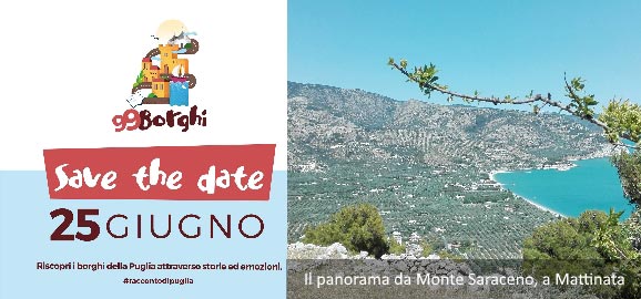 Tutti siamo invitati a partecipare sia dal vivo domenica 25 giugno sia sui social, condividendo foto e post che raccontino i borghi di Puglia con l’hashtag #raccontodipuglia. L’iniziativa 99 borghi – #RaccontodiPuglia, è promossa da Confcommercio Puglia in collaborazione con Confguide Puglia e PugliaPromozione. Le visite guidate gratuite saranno a cura delle guide della rete Confguide certificate dalla Regione Puglia.