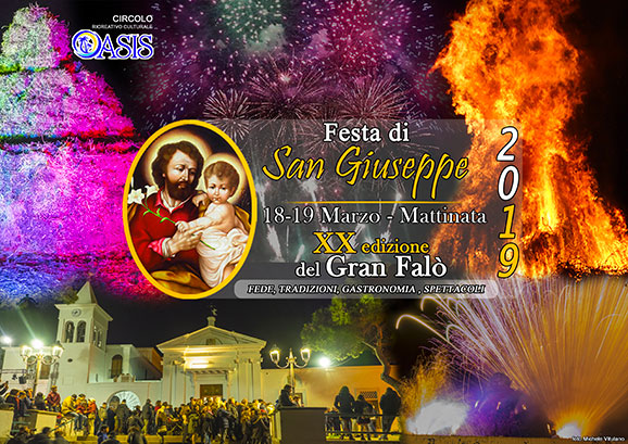 Una due giorni, 18 e 19 marzo p.v., dedicata ai festeggiamenti in onore di San Giuseppe caratterizzata da celebrazioni religiose e civili. Già dalle prime ore del mattino lo sparo dei mortaretti e il giro per le vie cittadine della Marching Band dall’Associazione Bandistica di Mattinata apriranno la festa, che culminerà con la spettacolare accensione piromusicale del Gran Falò. Durante la serata non mancheranno gli stand gastronomici con i prodotti tipici locali e faranno da cornice con i brani della musica popolare i Folk Brothers, a chiudere la giornata del 18, l’immancabile spettacolare batteria sanseverese.