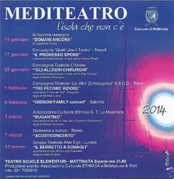 Sabato 8 febbraio il concerto di “GIBBONI FAMILY” – Salerno. 1 marzo 2014, sesto appuntamento della Rassegna con l’Associazione Culturale Ethnica G.T. La Maschera con la commedia musicale in due atti di Garinei e Giovannini “RUGANTINO” – regia di Matteo Sansone. Il 7 marzo l’Orchestra a bottoni di Roma si esibirà in “ACUSTICONCERTO”. Ultimo appuntamento di Mediteatro è il 15 marzo con la commedia in due atti di Luigi Pirandello “IL BERRETTO A SONAGLI” del Gruppo Teatrole Alter Ego (Lucera) – regia Lello di Gioia.