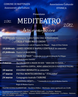 Al via la I edizione di MEDITEATRO, rassegna teatrale organizzata dall’Assessorato alla Cultura del Comune di Mattinata e dall’Associazione Culturale Ethnica, sette imperdibili appuntamenti con la prosa, la musica, il cabaret. “Arte in Navigazione”, questo il sottotitolo che gli organizzatori hanno coniato per il cartellone di questo primo anno, a testimoniare ed evidenziare il filo logico che tiene assieme gli spettacoli che si susseguiranno nei mesi di febbraio e marzo.