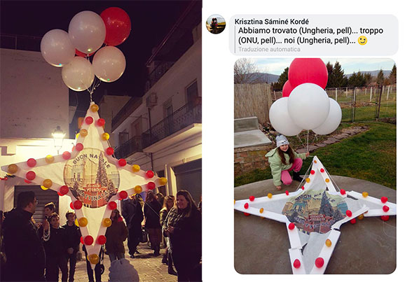 Tanta gioia e sorpresa per la famiglia ungherese che ha visto la stella posarsi, con i suoi palloncini colorati, nel proprio giardino. Il momento è stato immortalato in una fotografia dalla sorridente bambina che ha ricevuto l’inaspettato regalo di Natale sceso dal cielo. Attraverso Facebook è riuscita a mettersi in contatto con il Circolo Ricreativo Oasis di Mattinata.