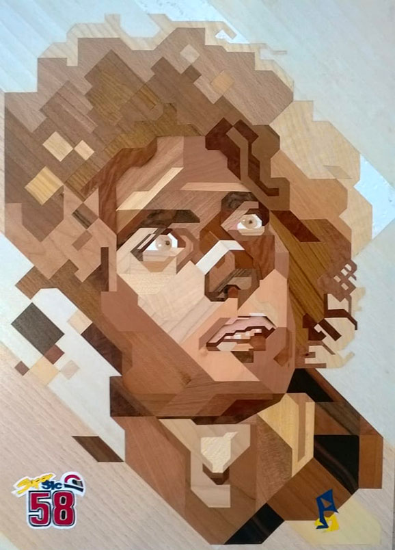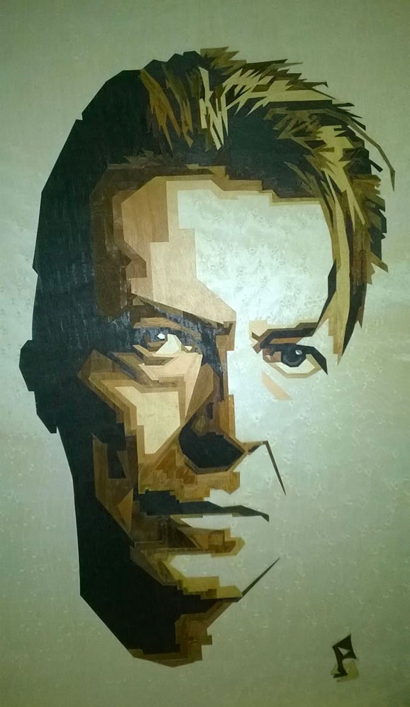 Così è per un David Bowie perfettamente interpretato da Prencipe, che ne enfatizza le spigolosità del volto che poi di fatto era dolce. Altro protagonista della musica Pop è Michael Jackson che l’intarsiatore riesce a rendere cosa viva attraverso un sapiente uso dei contrasti luminosi delle essenze del legno, su cui spesso opera con sabbie rese roventi così da dare al legno una coloritura diversa. Ai cantanti si uniscono una serie di ritratti di attori e attrici, una incantevole Marilyn Monroe, un Charlie Chaplin. La maestria di Michele Prencipe si rivela anche in altre tarsie con soggetti naturalistici dove le sfoglie di legno sono al naturale e solo alcune parti sono trattate con legno colorato, così da creare effetti di apparizione degli elementi quasi d’incanto. E’ il caso delle Mani di un giocatore di carte, dove il colore dell’incarnato delle mani è tutt’uno con lo sfondo.