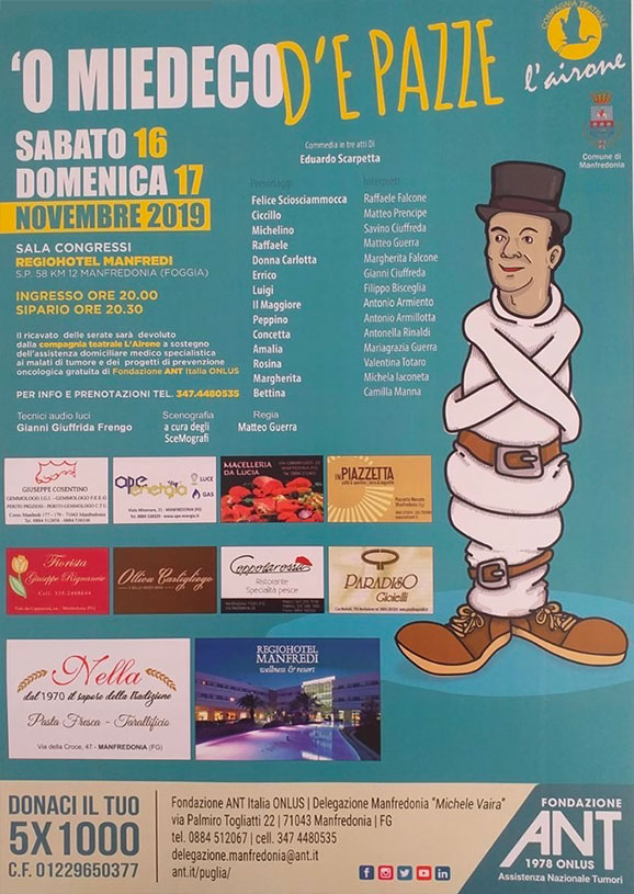 L’Airone andrà in scena, sabato 16 e domenica 17 novembre, presso la sala congressi del Regiohotel Manfredi, con il loro ultimo lavoro Teatrale ”O’ miedeco d’e pazze”.