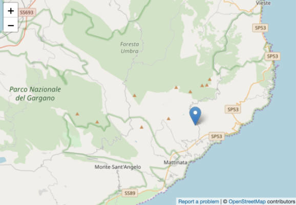 Un terremoto di magnitudo ML 2.7 è avvenuto nella zona: 5 km NE Mattinata (FG), il 19-09-2017 20:58:02 (UTC) 9 ore, 52 minuti fa 19-09-2017 22:58:02 (UTC +02:00) ora italiana con coordinate geografiche (lat, lon) 41.75, 16.08 ad una profondità di 11 km.
